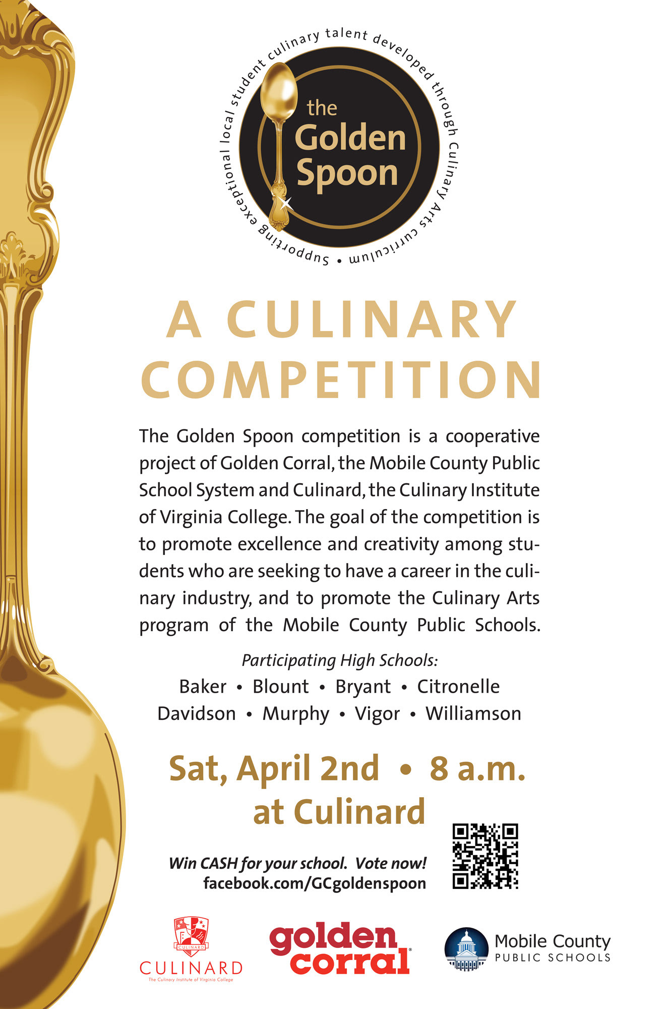 The Golden Spoon — this set of printed pieces (8x3' banner, poster, window cling) was designed to advertise Golden Corral's Golden Spoon competition for high school level students, in cooperation with Culinard and with various public school systems. I created the gold spoon vector graphic, designed the competition logo, and designed each of the printed pieces in the set. With information customized for different school systems, Golden Corral used this set of pieces to advertise several Golden Spoon competitions.